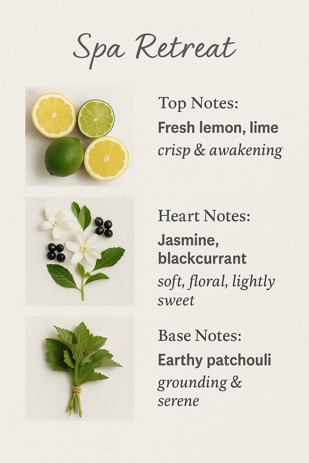 Base: Patchouli – earthy, meditative, and deeply soothing